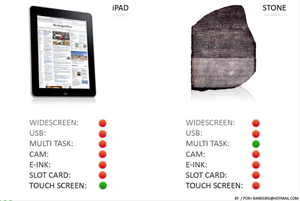 The Apple iPad, also referred to as the iPod Touch XL, is a revolutionary technological device created by Apple, Inc. Released in early 2010, it comes with never-before-seen features such as the ability to send messages to others through text at near-light speed, for the low cost of $29.99/month. Because it's shiny and made by Apple, it's certain to be a hit amongst iPhone and Mac users worldwide.